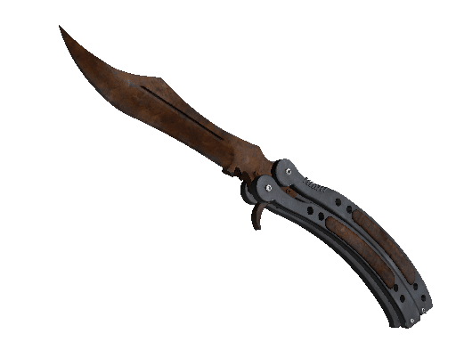 This is a custom-designed balisong, commonly known as a butterfly knife. The defining characteristic of this weapon is the fan-like opening of a freely pivoting blade, allowing rapid deployment or concealment. As a result, butterfly knives are outlawed in many countries. It is still perfectly operational although the exterior surfaces have rusted.