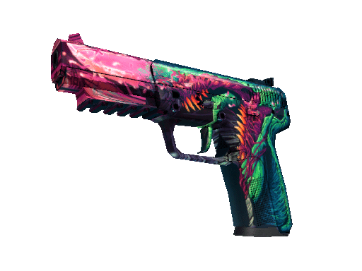 Highly accurate and armor-piercing, the pricy Five-Seven is a slow-loader that compensates with a generous 20-round magazine and forgiving recoil. It has been custom painted with a beastly creature in psychedelic colors.