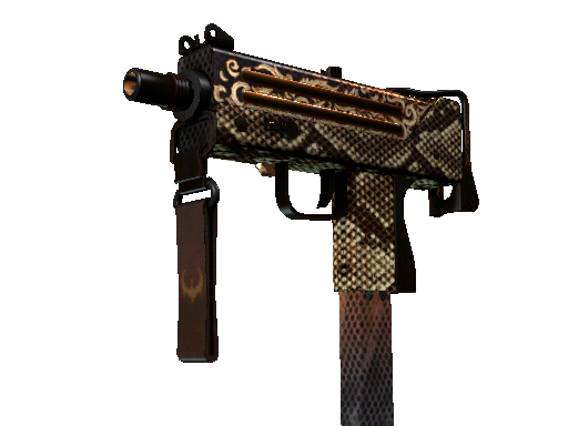 Essentially a box that bullets come out of, the MAC-10 SMG boasts a high rate of fire, with poor spread accuracy and high recoil as trade-offs. It has been custom painted with a bronze snakeskin pattern and a coiled snake beneath the wire form butt.
