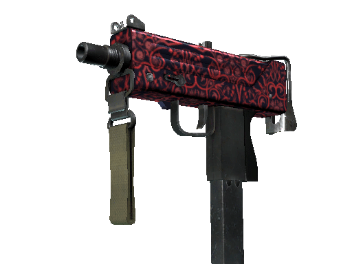 Essentially a box that bullets come out of, the MAC-10 SMG boasts a high rate of fire, with poor spread accuracy and high recoil as trade-offs. A red millefleur hydrographic has been applied.
